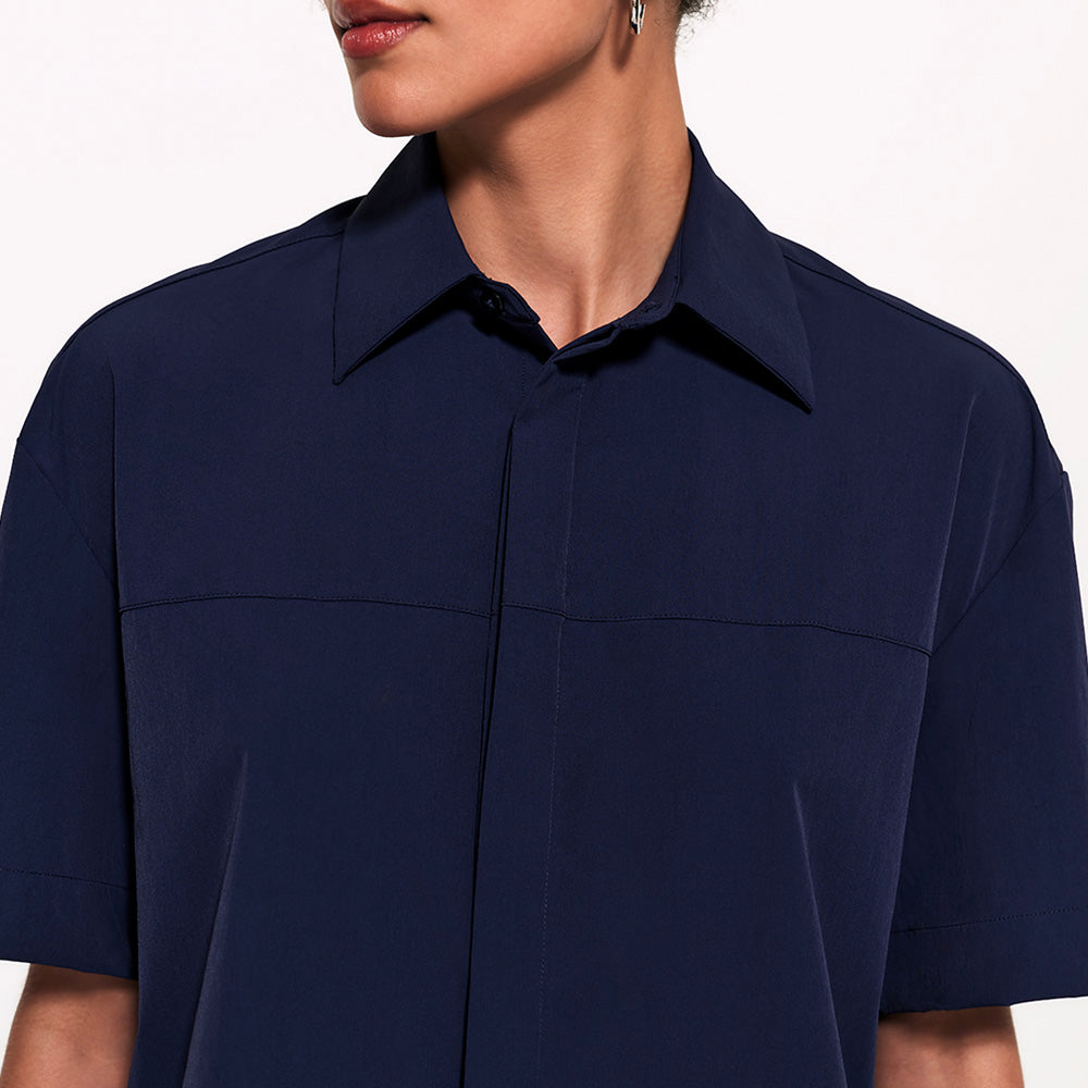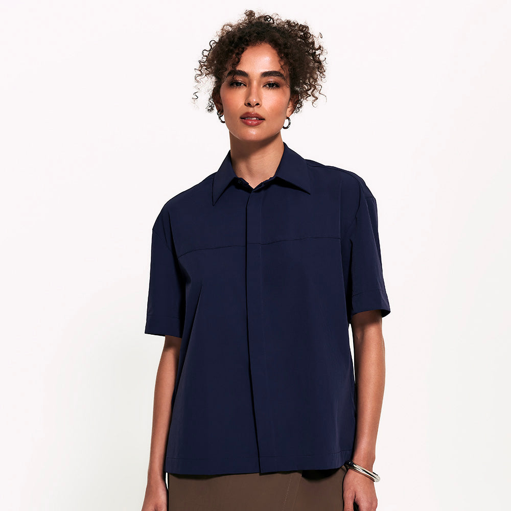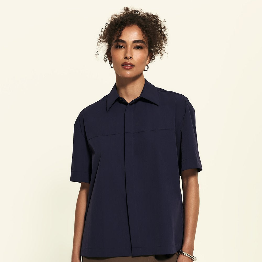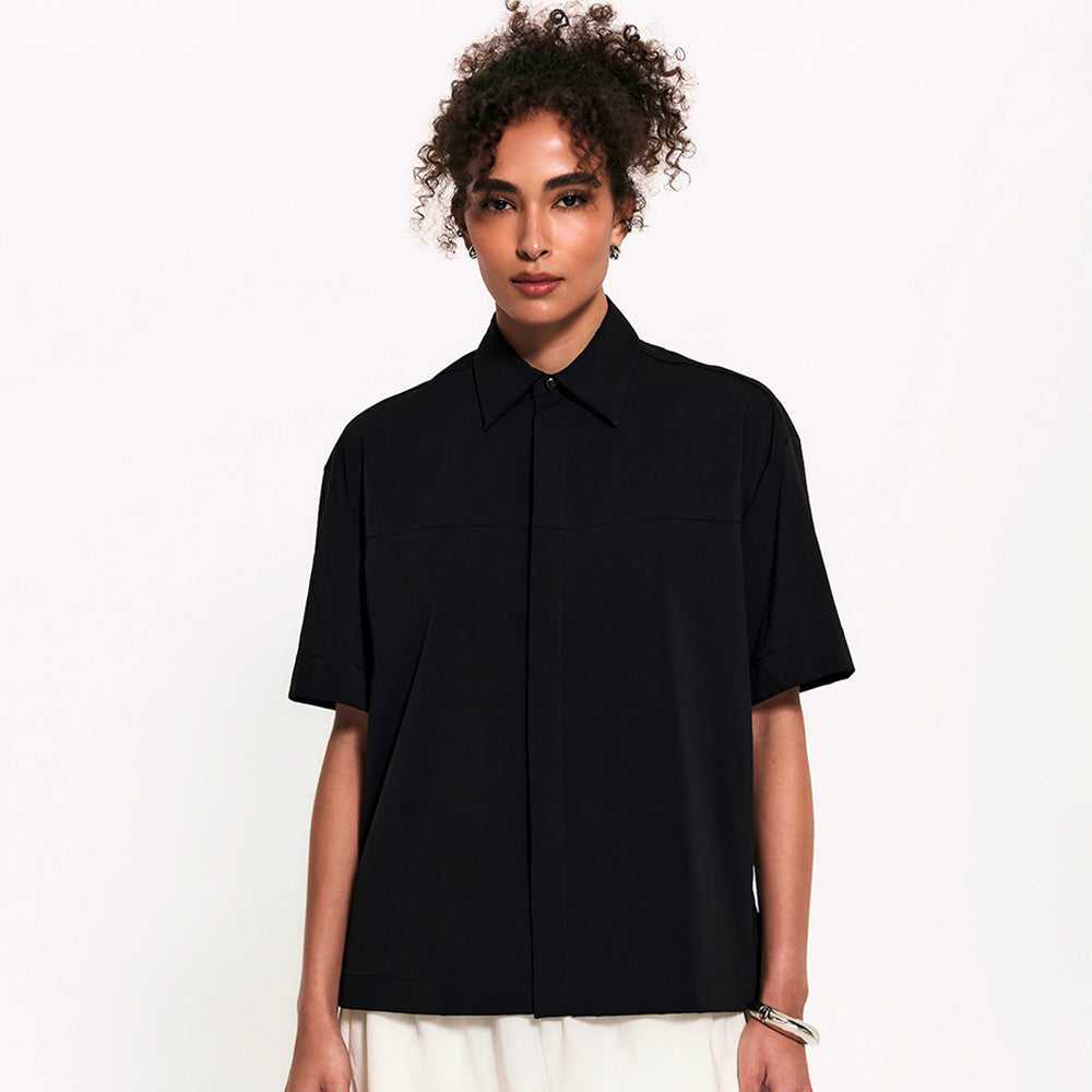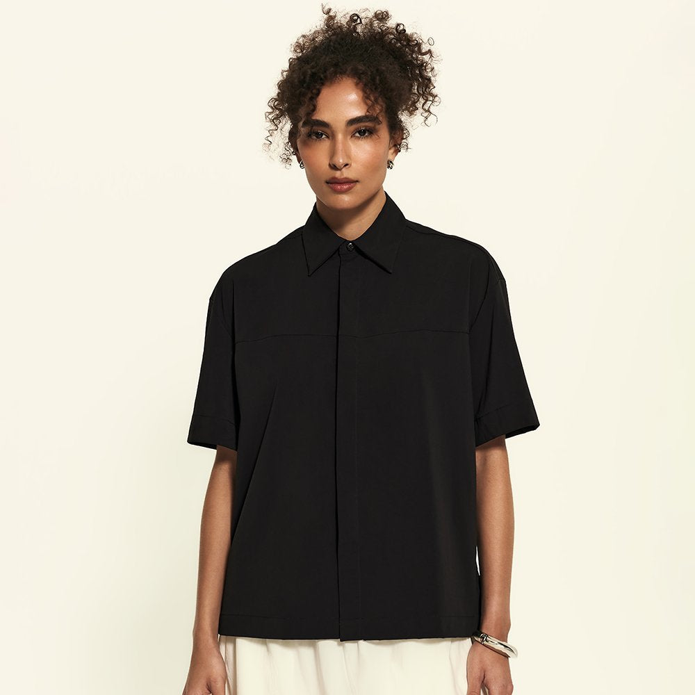 A Camisa Manga Curta FutureForm é a peça que faltava no seu guarda-roupa: um shape oversized com mangas amplas e recortes de design que elevam o visual. É estruturada na medida e tem vista totalmente embutida: quando fechada, os botões desaparecem, sobrando apenas o da gola para um detalhe sutil e elegante. Versátil por natureza, ela vai do trabalho aos dias casuais com leveza. Fechada, ganha ar de alfaiataria, já aberta, se adapta a combinações descontraídas e frescas.