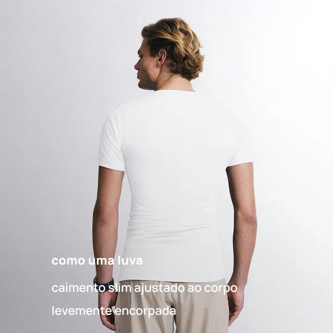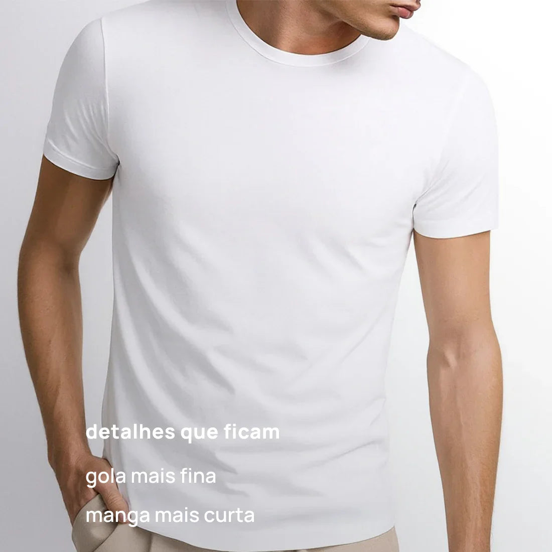 - Versão Slim: gola fina, mangas levemente mais curtas, larguras levemente mais ajustadas.