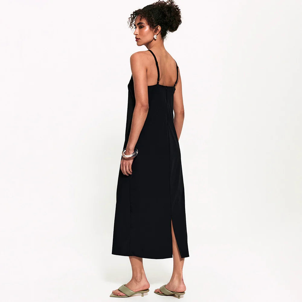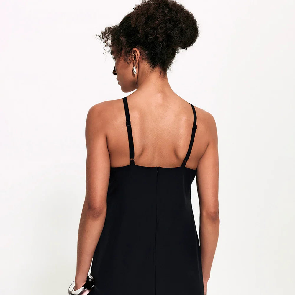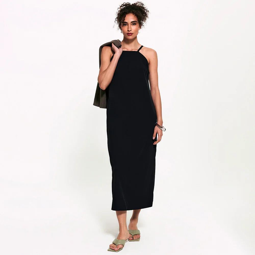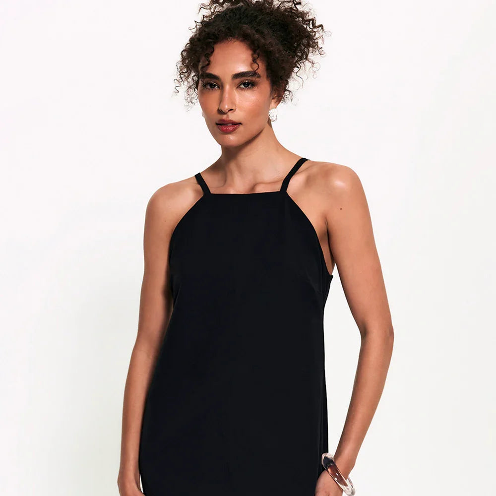 Aquele vestido essencial que consegue ser arrumado e descomplicado ao mesmo tempo. A modelagem midi alonga a silhueta, enquanto as alças finas com reguladores no mesmo tom da peça trazem leveza e um visual clean chic. O decote reto fechado e o zíper posterior completam o design clean com um toque de sofisticação.