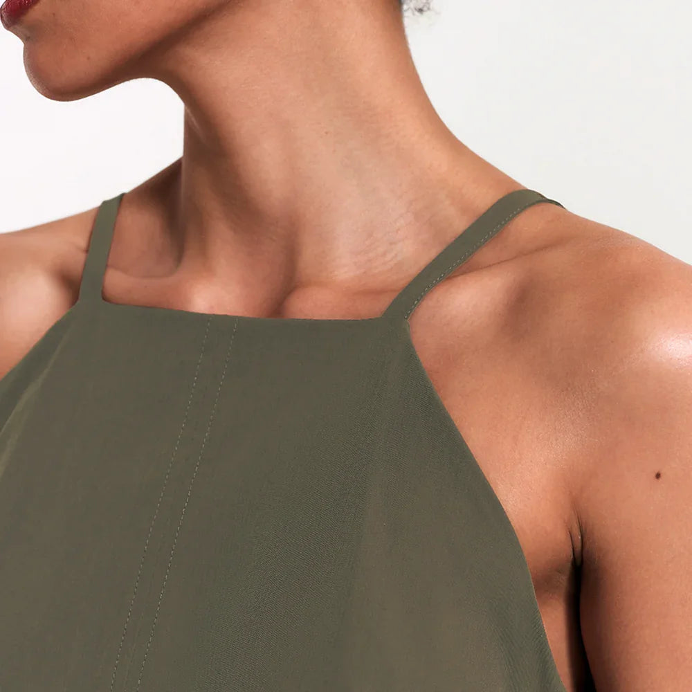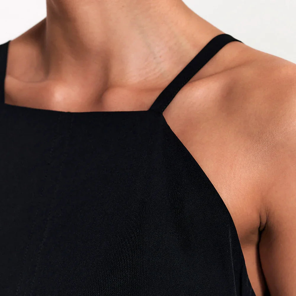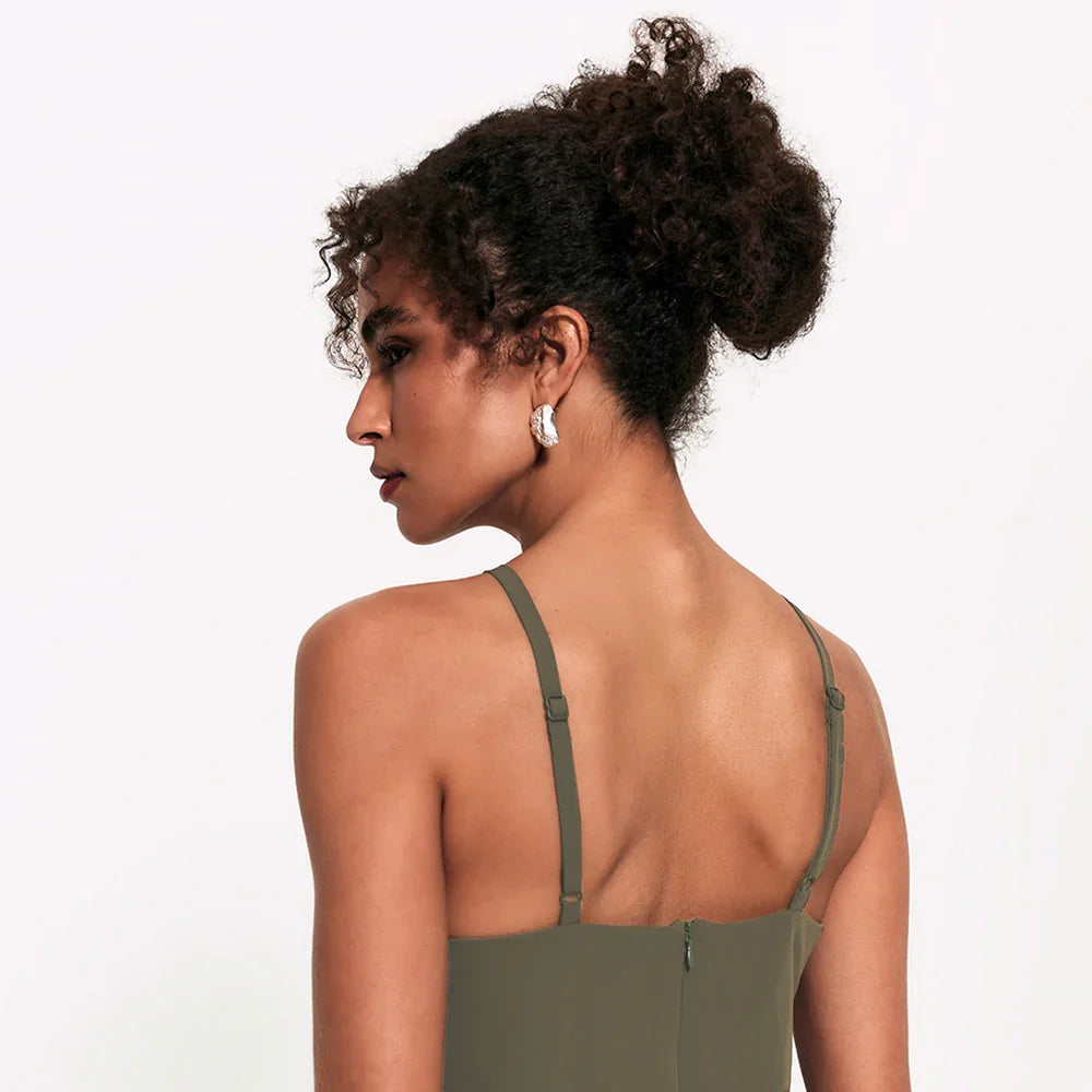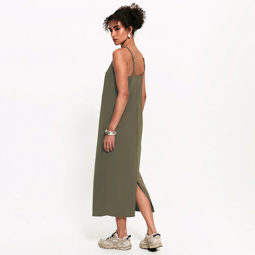 Aquele vestido essencial que consegue ser arrumado e descomplicado ao mesmo tempo. A modelagem midi alonga a silhueta, enquanto as alças finas com reguladores no mesmo tom da peça trazem leveza e um visual clean chic. O decote reto fechado e o zíper posterior completam o design clean com um toque de sofisticação.